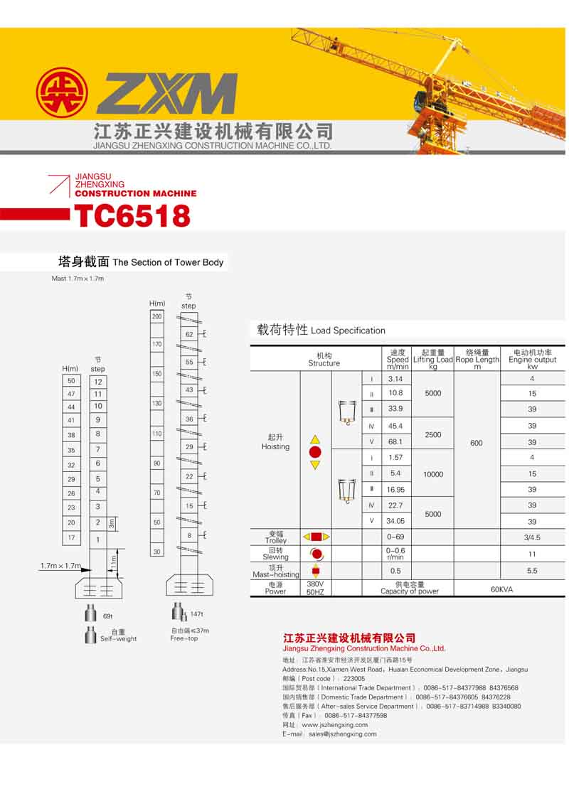 2、最大工作幅度65米,最大起重量10噸,末端最大起重量1.8噸,額定起重力矩1600KN.M;
